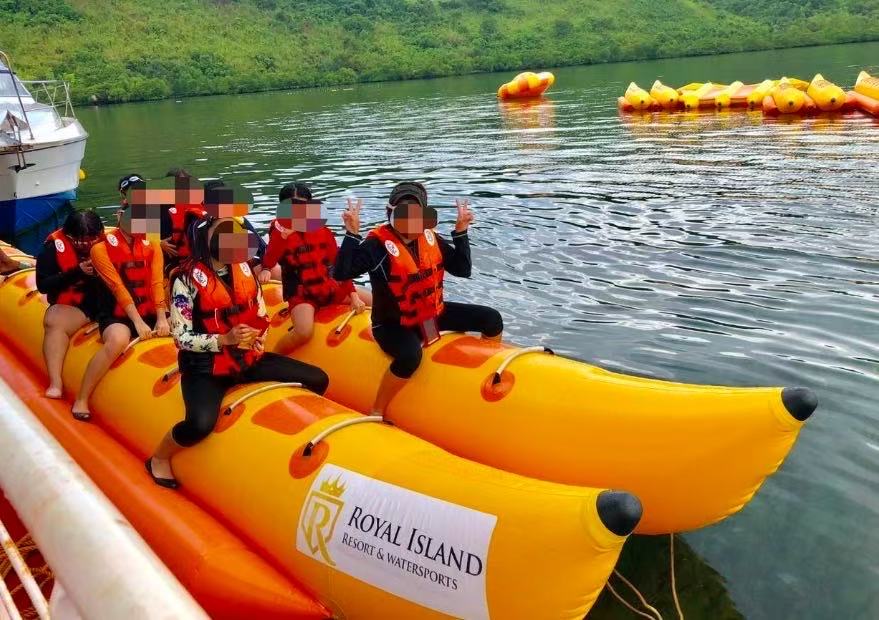 香蕉船,刺激不吓人,在湖上飞驰,湖风吹过,浪花溅在身上,转弯的时候微微倾斜,刺激感刚刚好,快乐直接拉满!