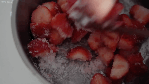 3、草莓入锅,不加水,小火熬煮半小时,煮至冒泡,撇去浮末;